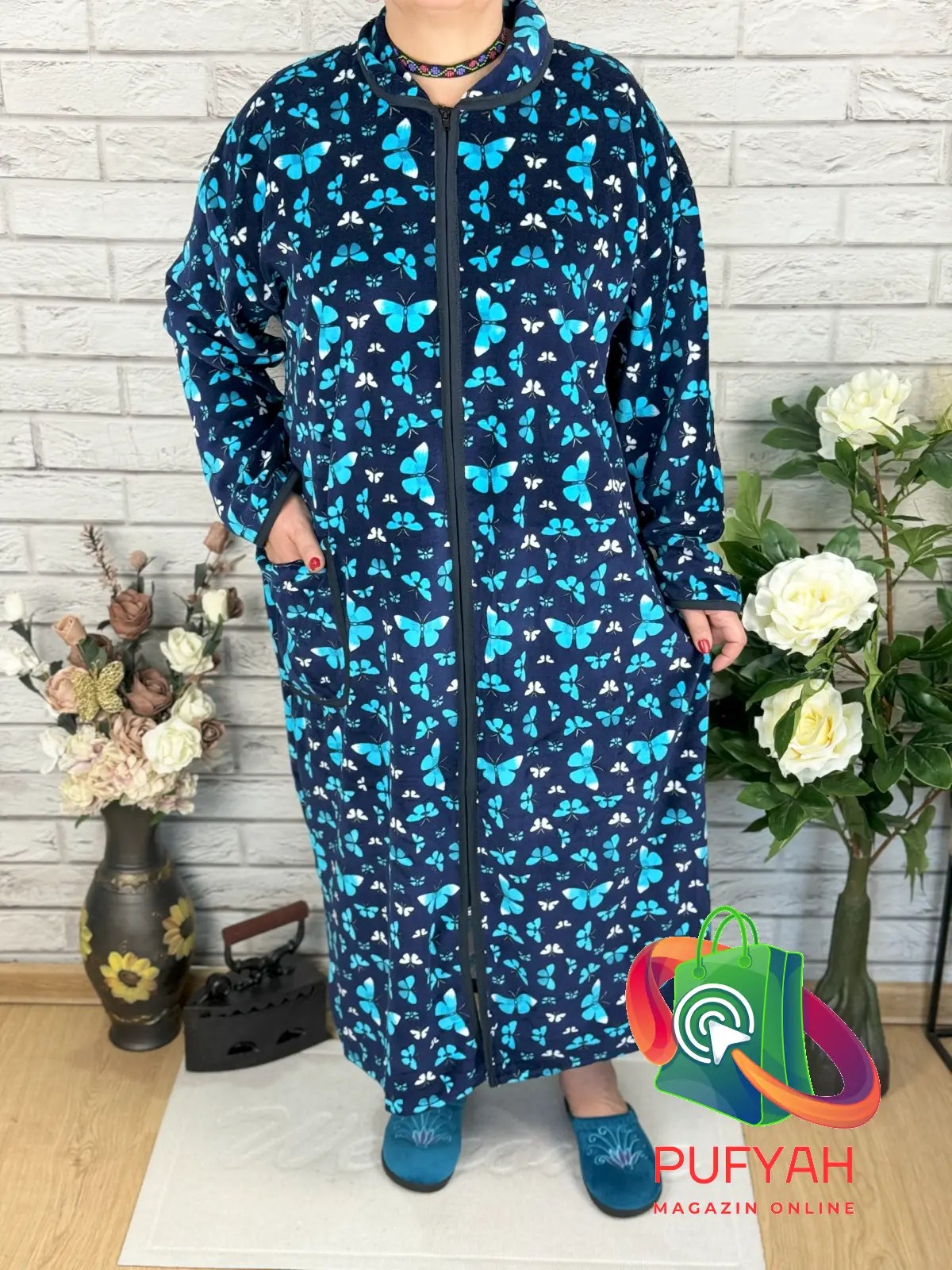 Capot mărime mare din catifea, cu fermoar si guler, Albastru fluturasi – CPC76